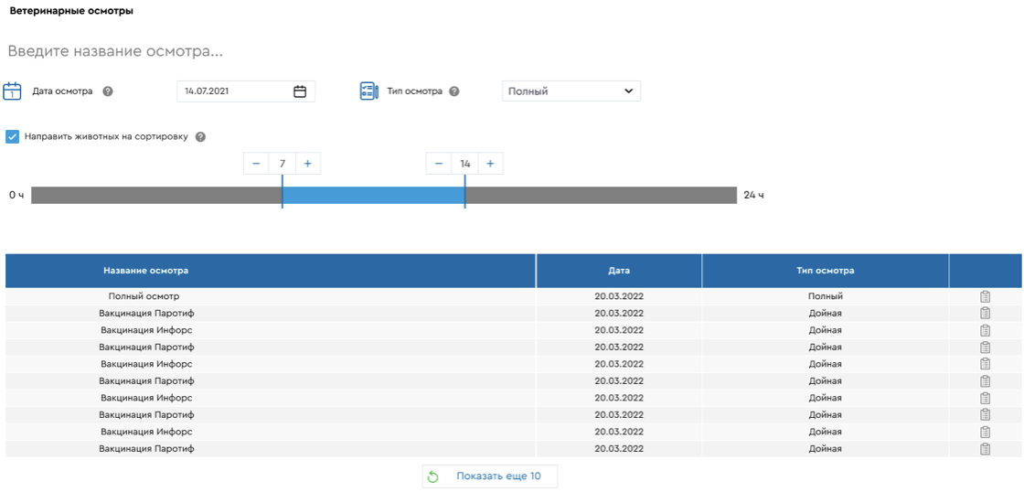 - Кнопка «Показать еще 10» - добавляет в список осмотров еще 10 результатов.
