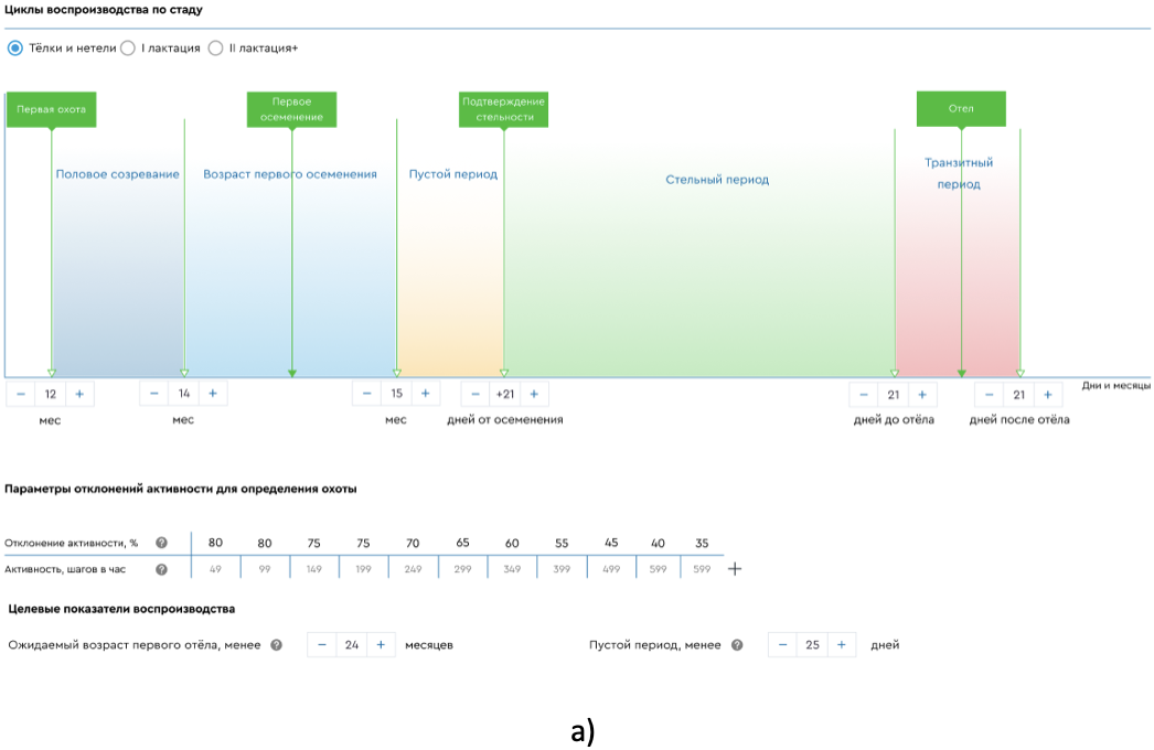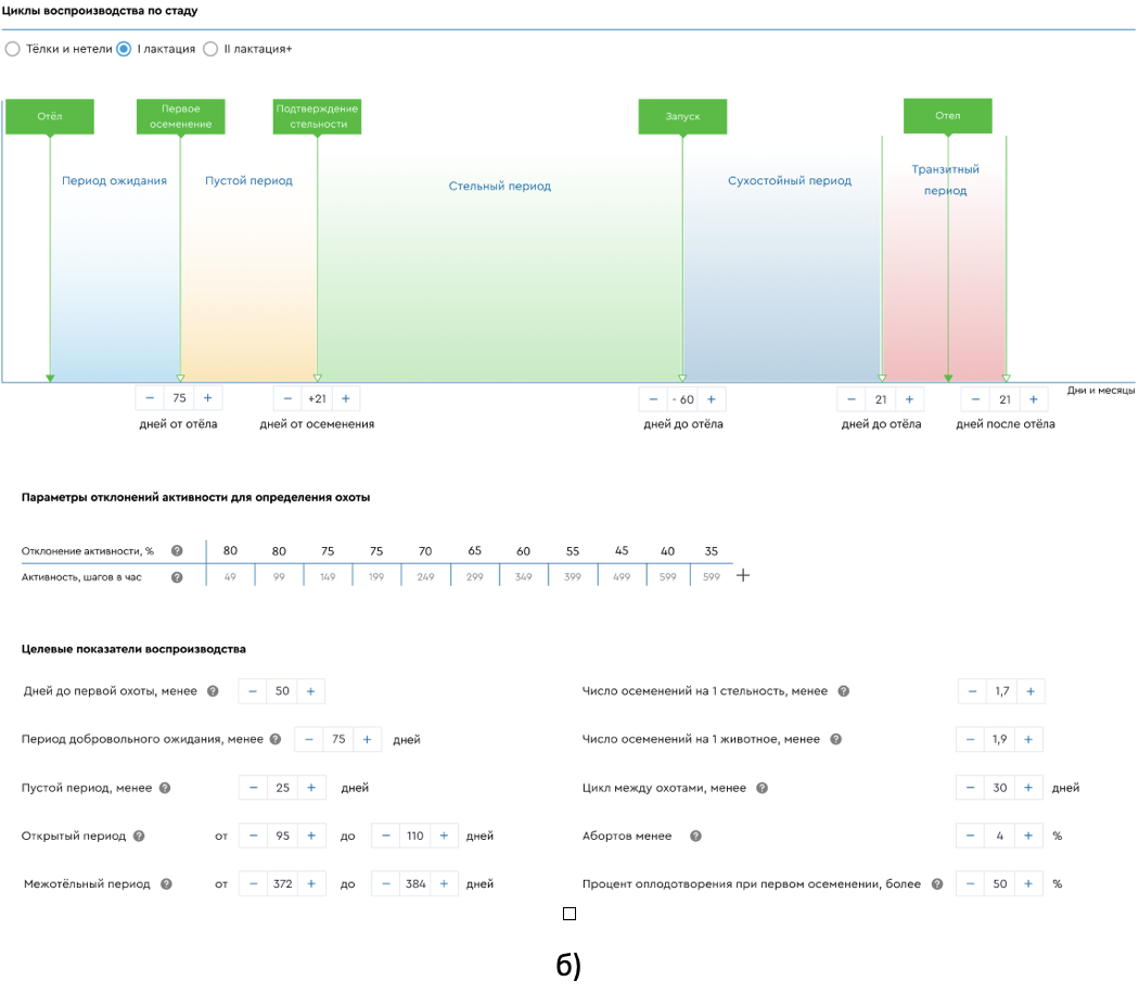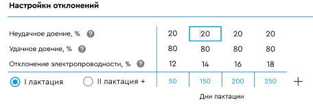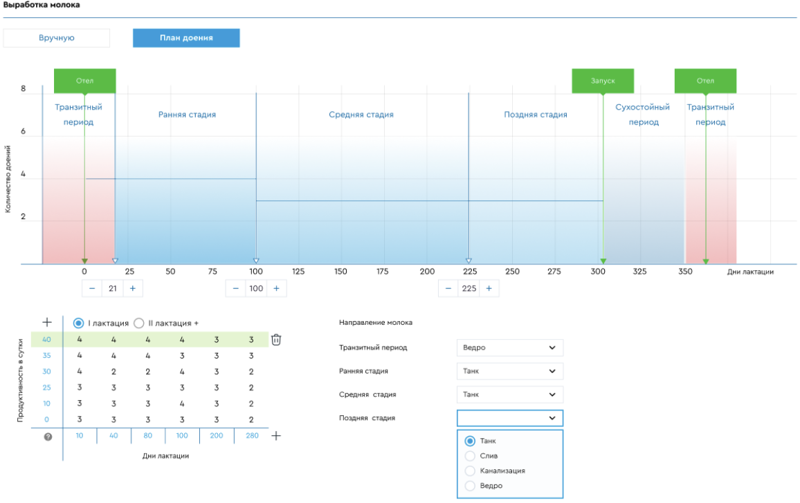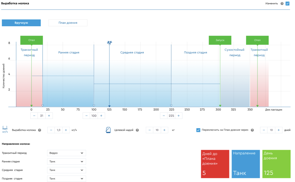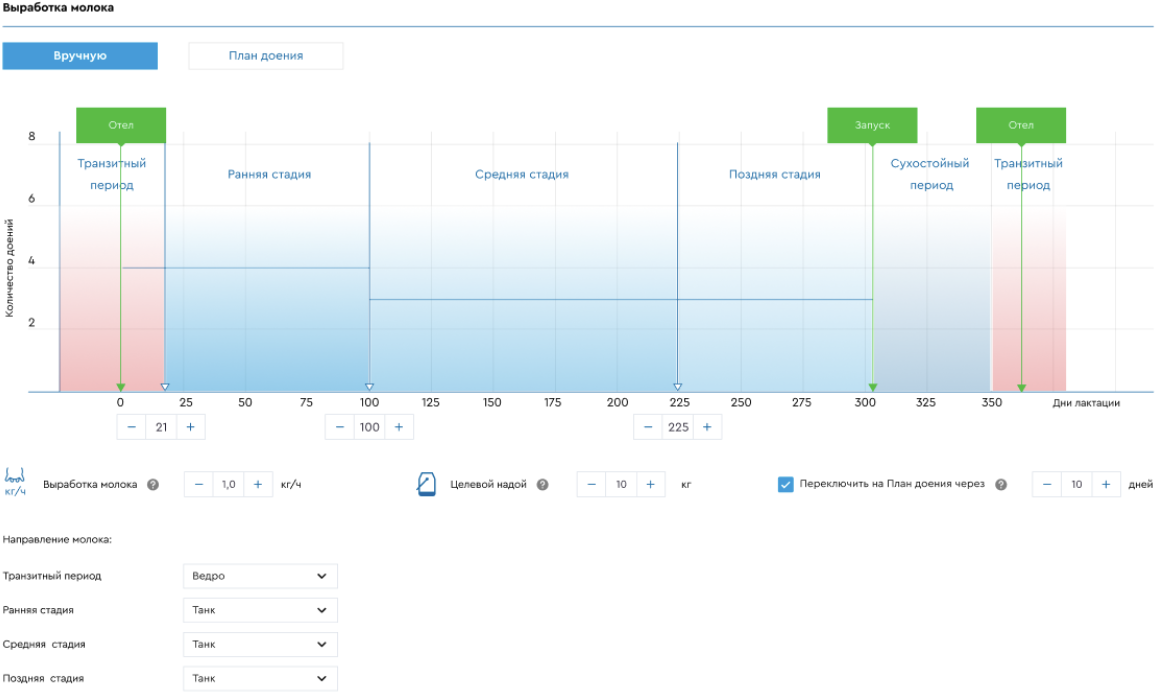 - Дней до «Плана доения» - количество дней от начала лактации (день 1) или от даты активации чекбокса (день лактации на указанную дату) до перехода на выработку молока по плану доения;