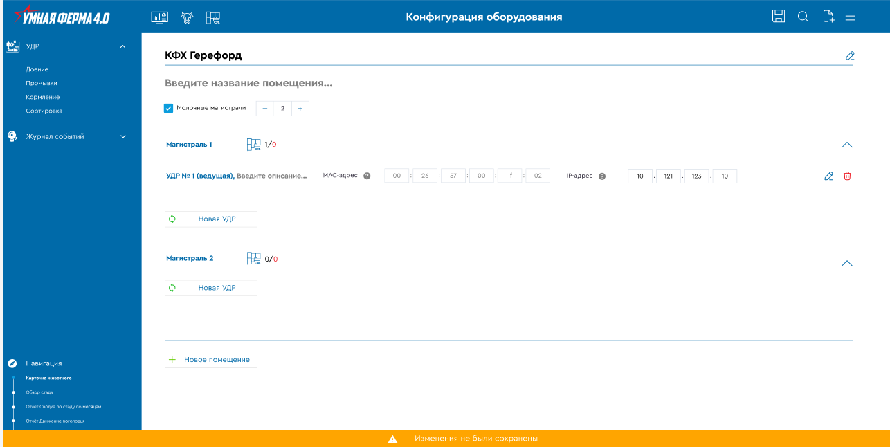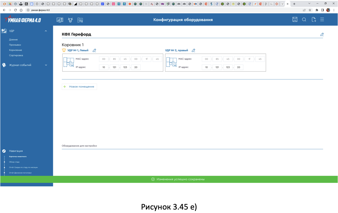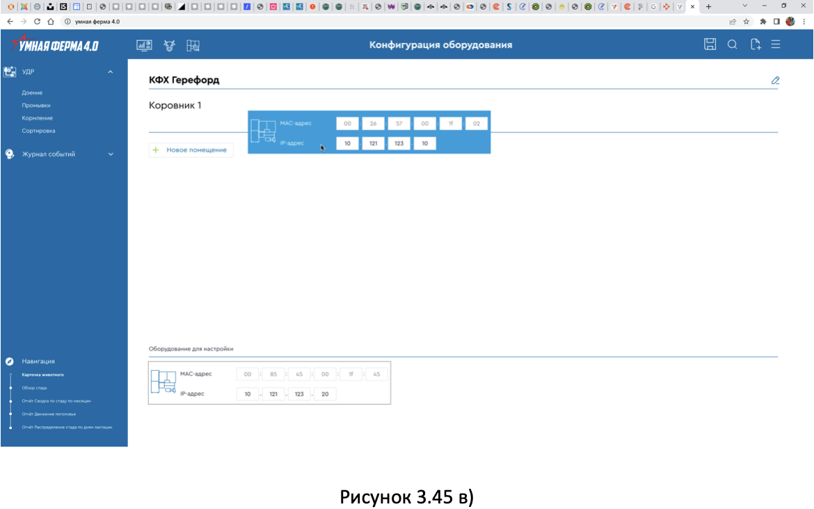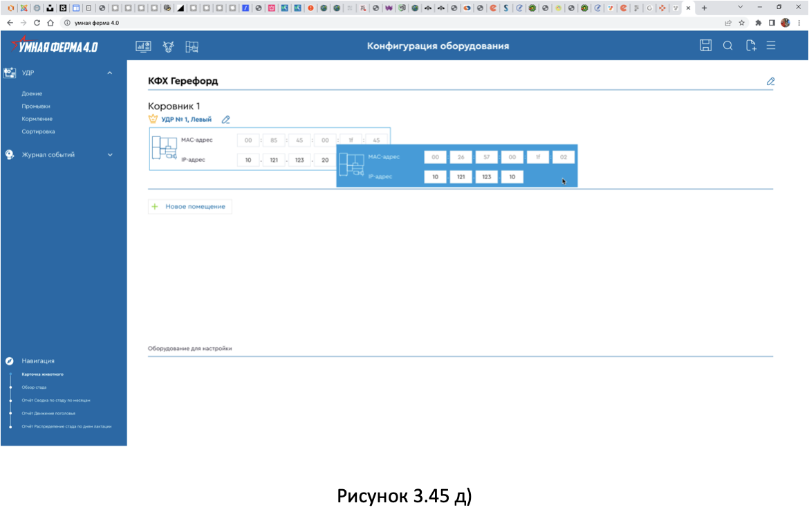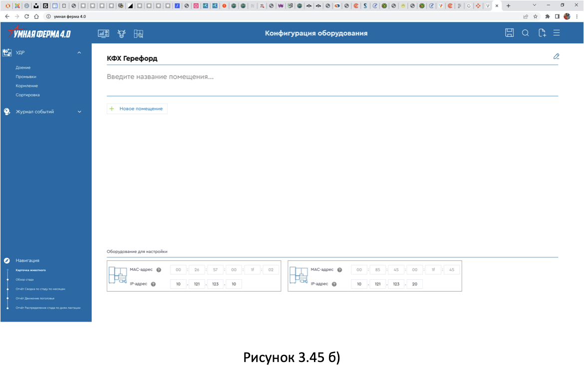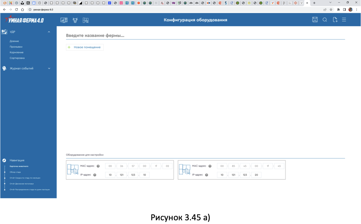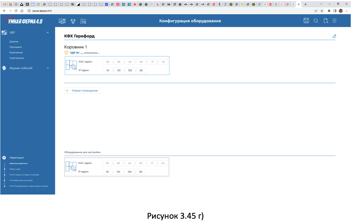 При развертывании системы, оператору необходимо присвоить название фермы, создать в программе помещения (рис 3.45 б) в которых будет располагаться оборудование, сгруппировать оборудование по помещениям (3.45 в,г) и молочным магистралям (в случае УДР (3.45 д,е)).