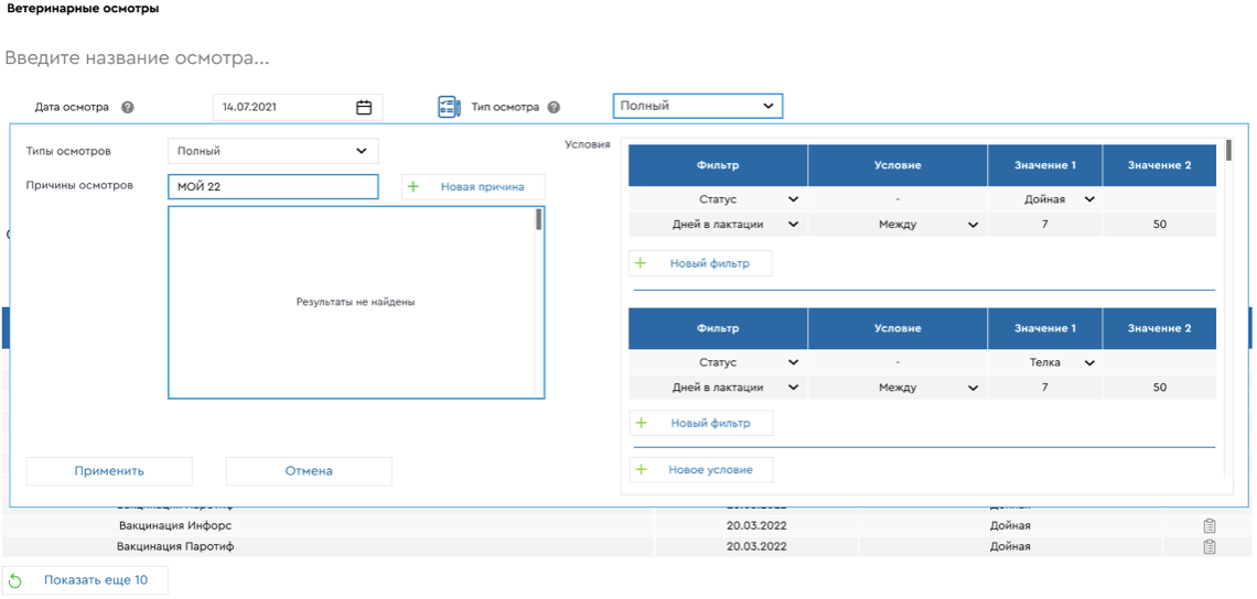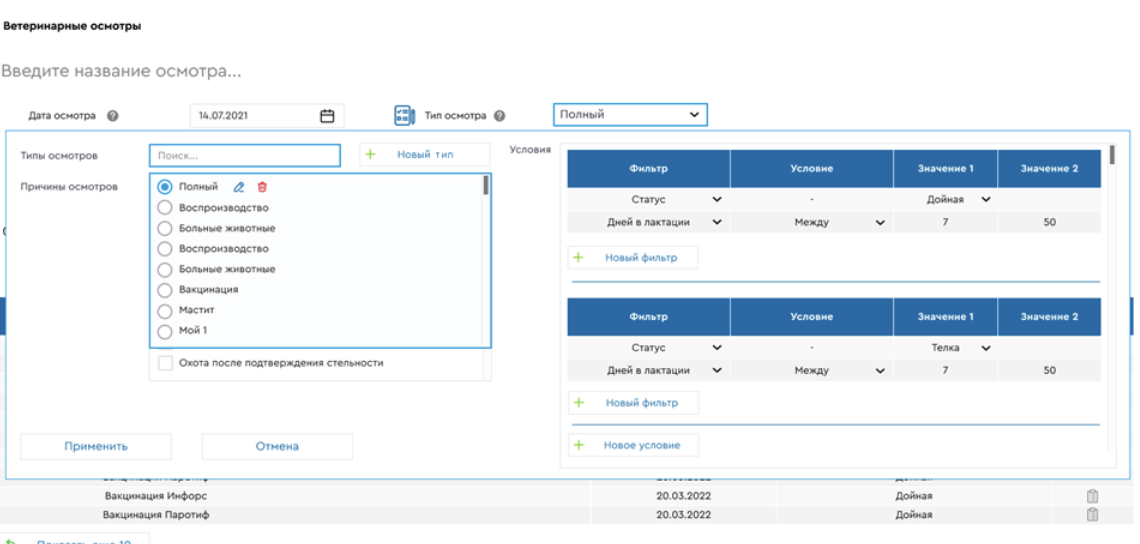 3. Выберете Тип осмотра. В выпадающем меню откроется конфигуратор (рисунок 3.33). Выберете Тип осмотра, при необходимости отредактируйте условия отбора животных.