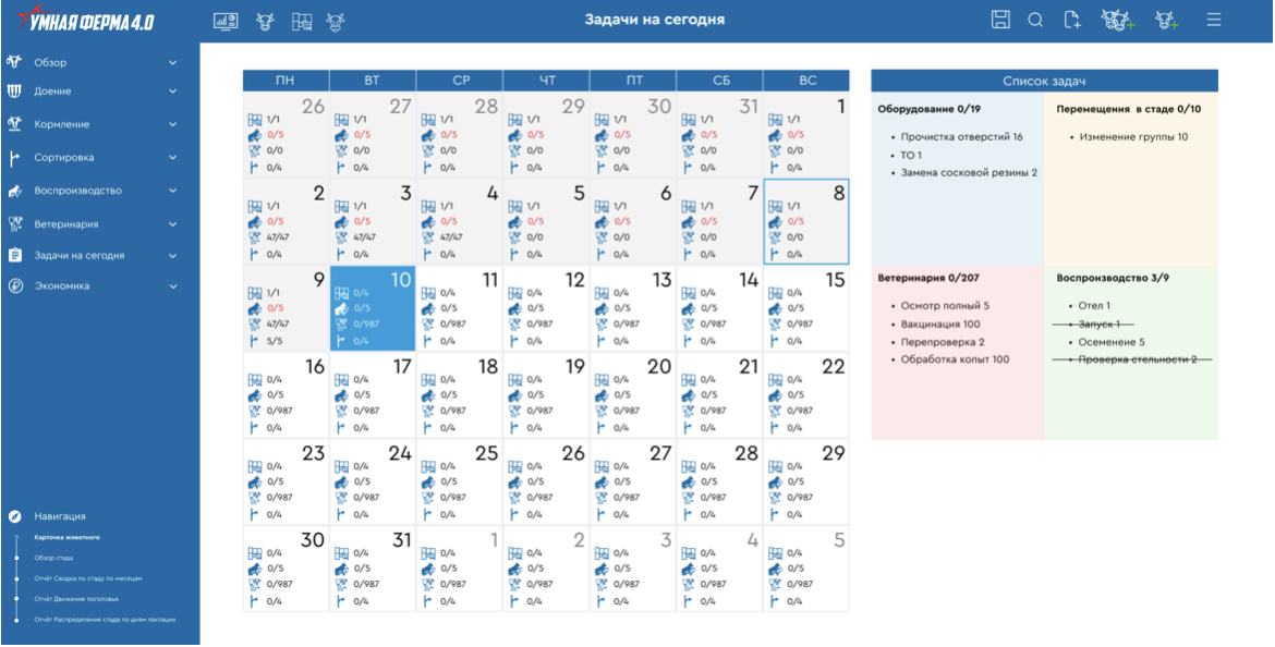 На странице отображается календарь, дни календаря содержат пиктограммы: оборудование; перемещения в стаде; ветеринария; воспроизводство и количества задач к выполнению / выполненных задач.