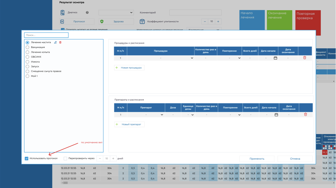 Для назначения лечения необходимо нажать на пиктограмму «Протокол», далее выбрать необходимый протокол лечения (рисунок 3.72), создать собственный или ввести процедуру и/или лекарство вручную (галочка использовать протокол снята (рисунок 3.73).