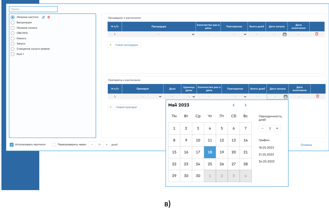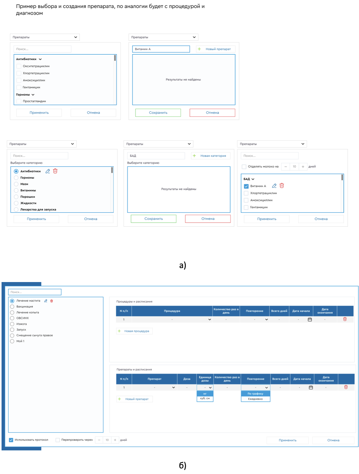 Интерфейсы выбора процедуры и лекарства показаны на рисунках 3.41 а), б), в).
