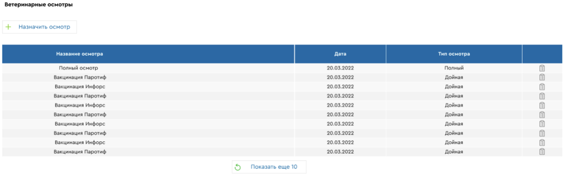 - «+ Назначить осмотр» - создание списка животных к осмотру;