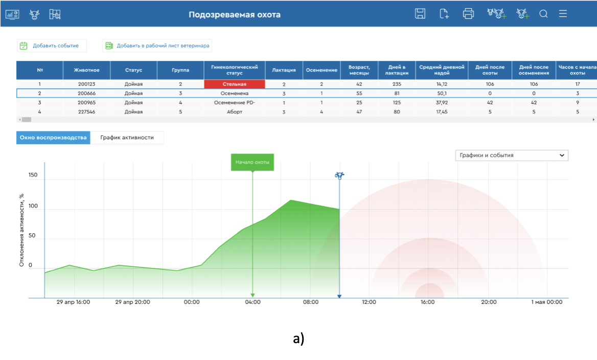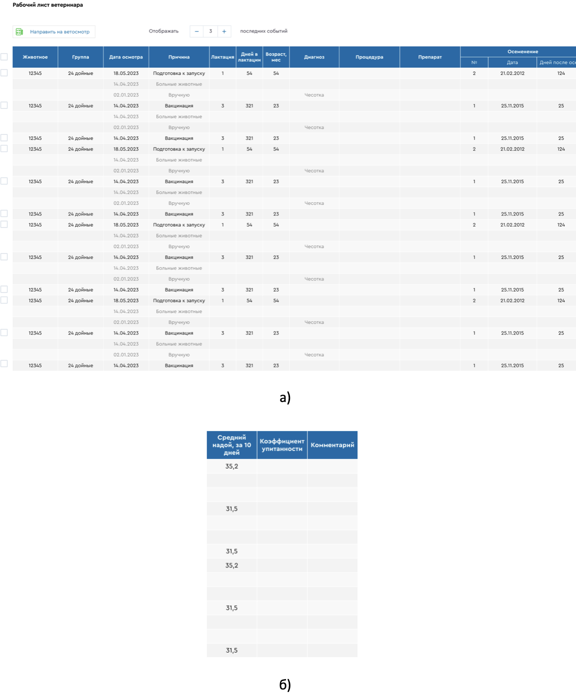 Рабочий лист ветеринара – список животных с которыми необходимо провести работу, в списке выводится 3 последних ветеринарных события. Рабочий лист заполняется ветеринаром в процессе проведения лечебных мероприятий, далее данные переносятся в Систему. Интерфейс рабочего листа ветеринара приведен на рисунке 3.42 а) и б).