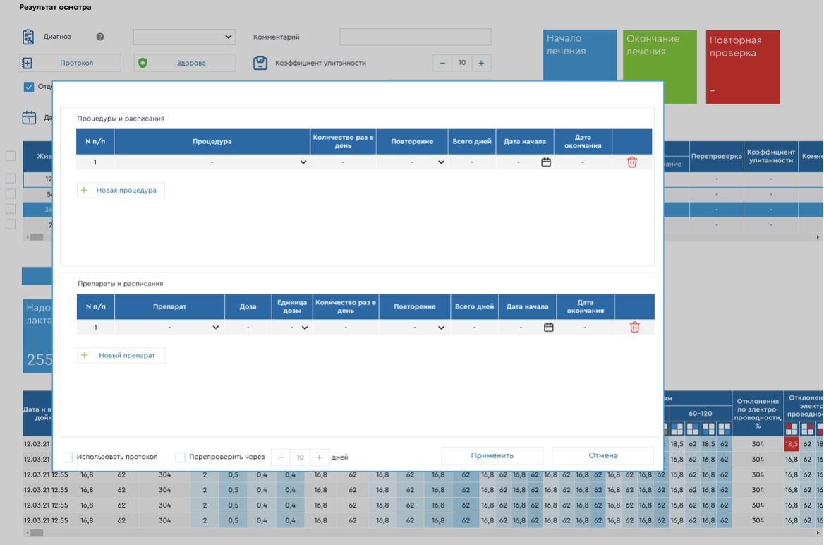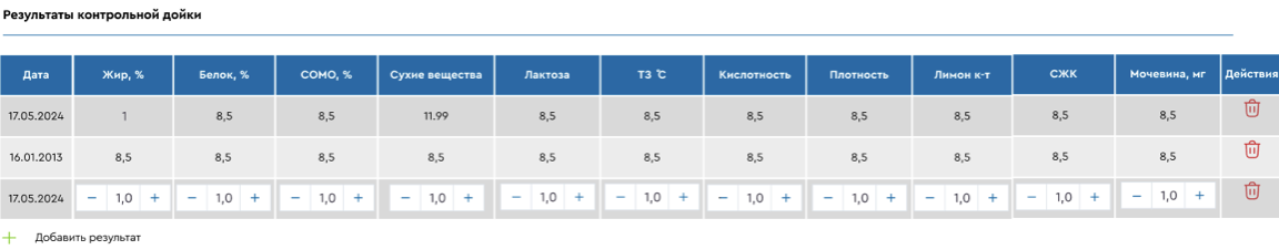 При вводе результатов контрольных доек из карточки животного, пользователь добавляет строку в таблицу для ввода новых результатов, при необходимости строку можно удалить.