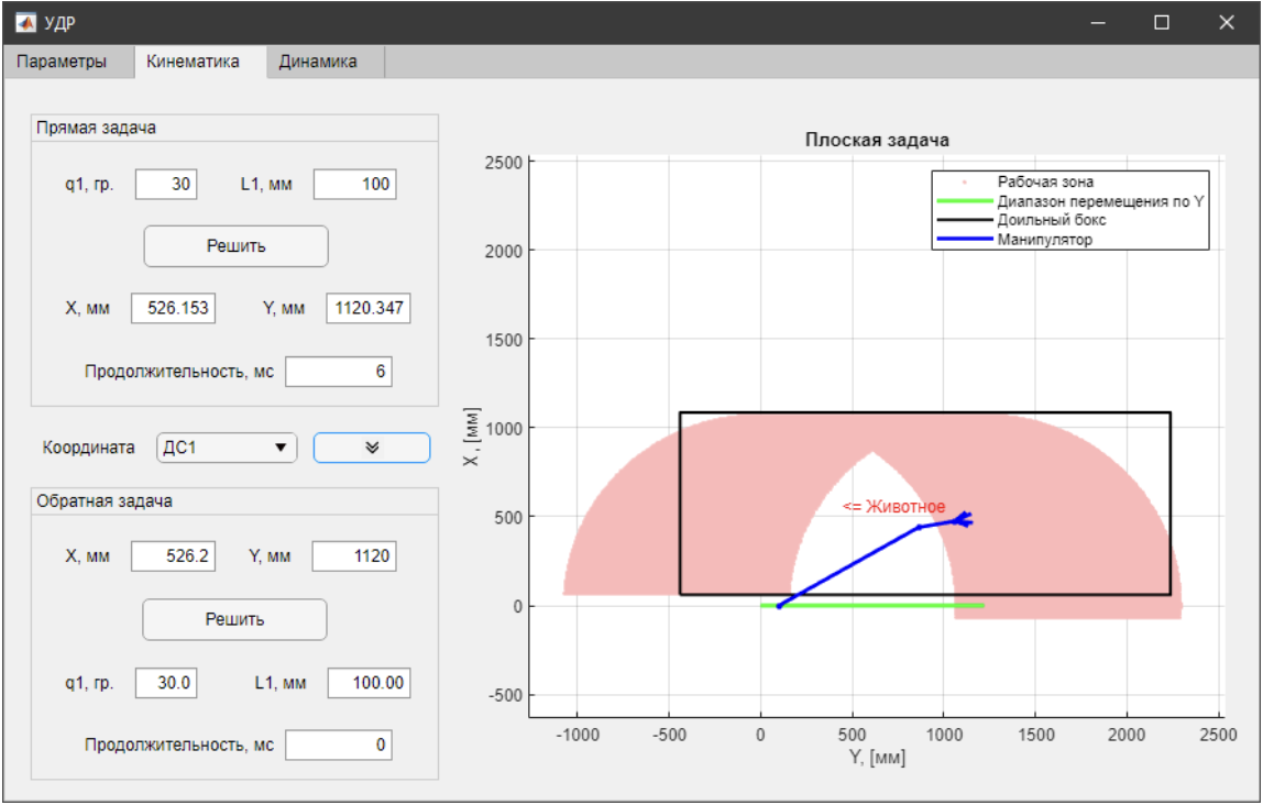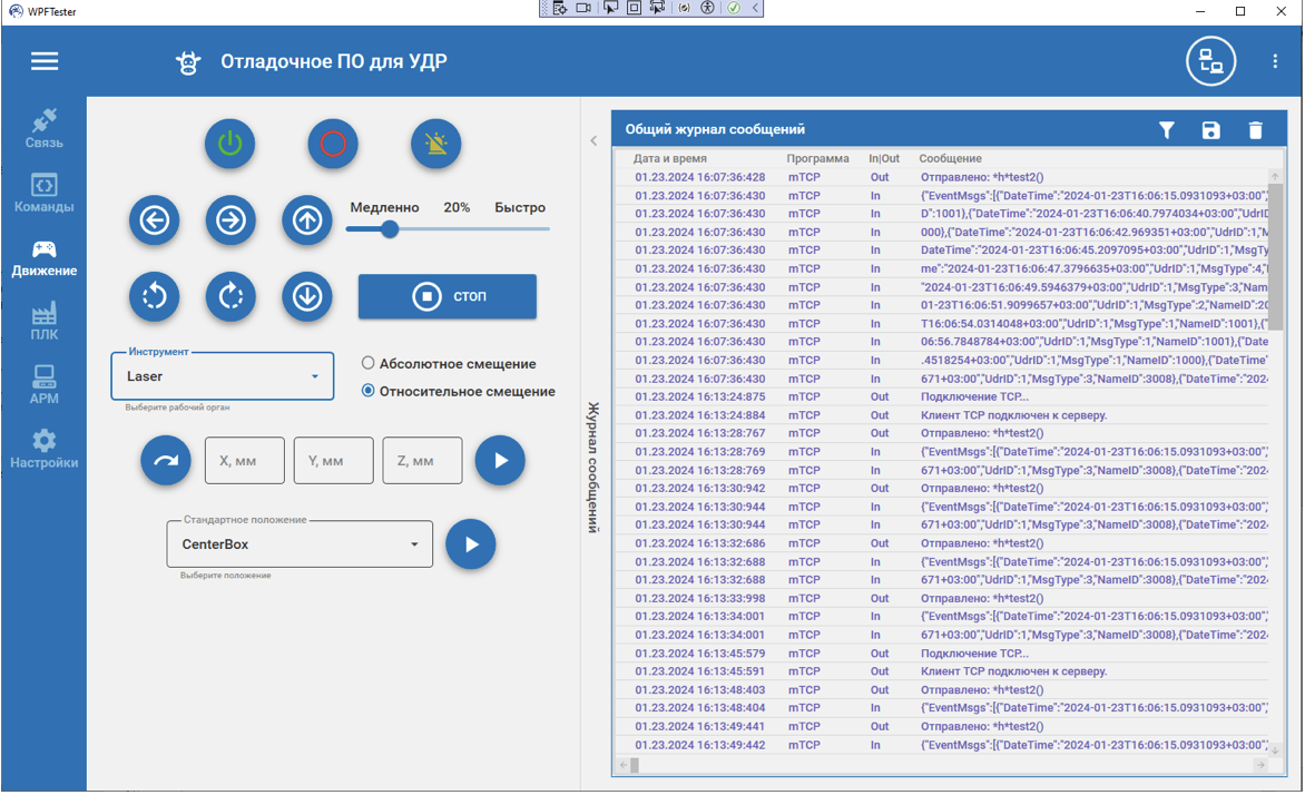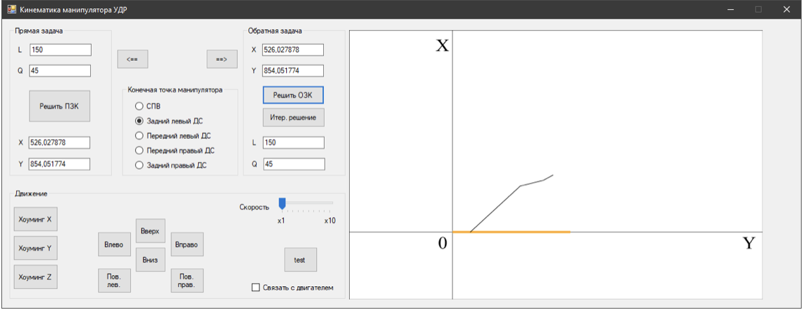 1.2 Ручное управление манипуляторомРучное управление манипулятором осуществляется через интерфейс. Перемещение манипулятора осуществляется нажатием соответствующей клавиши. Ручное перемещение может осуществляться в «быстром» и «медленном» режиме. Переключении режимов осуществляется нажатием. При «быстром» перемещении перемещение производится только в том случае когда кнопка зажата. При этом скорость плавно увеличивается до максимально допустимой для данного режима перемещения. После отпускания кнопки перемещения, осуществляется плавный останов. В случае «медленного» режима, перемещение осуществляется дискретным нажатием кнопки. При нажатии кнопки перемещение осуществляется на заранее зафиксированное минимальное смещение.